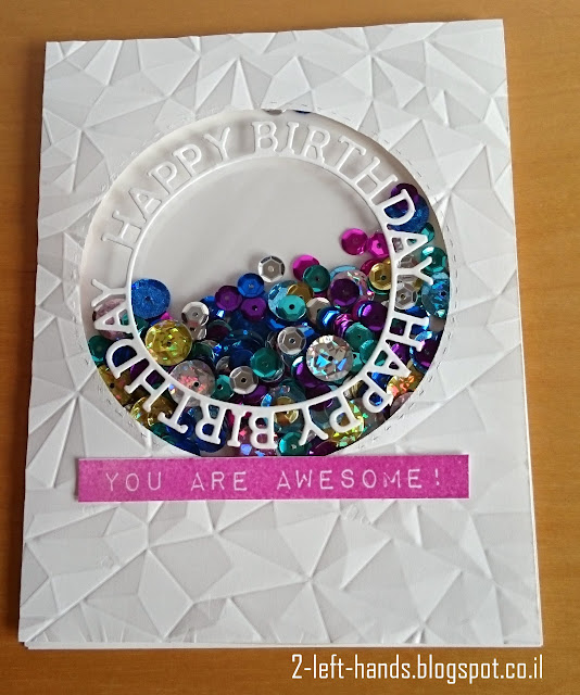 כרטיס יום הולדת שמח מלא הפתעות. את הרקע הבלטתי עם התבניות המקסימות של W R Memory Keepers. חתכתי חלון עם התבניות עיגול של SSS והכיתוב על החלון הוא גם תבנית חיתוך של SSS.
