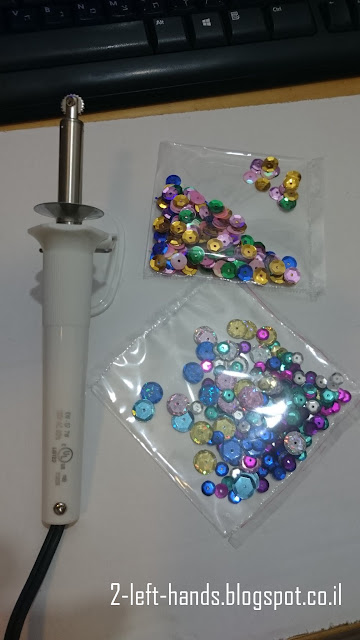 את הפייאטים הכנסתי בתוך שקיק קטנה שהכנתי עם הכלי המגניב החדש שלי ה- FUSE TOOL. הוא מתחמם ואז שעוברים על צידי השקית, הם מתחברים (מהחום). זאת דרך פשוט מגניבה לעשות כרטיסי שייקר. הפייטים לא נדבקים לי לדבק בצדדים וזה קל ונוח. אהבתי!